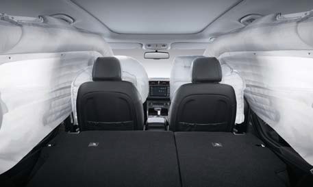 6-airbag system (Driver, Passenger, Side & Curtain) Standard front row protection includes a pair of depowered airbags but is upgradeable to include thorax protection (front only) and curtain airbags that shield first and second row occupants.